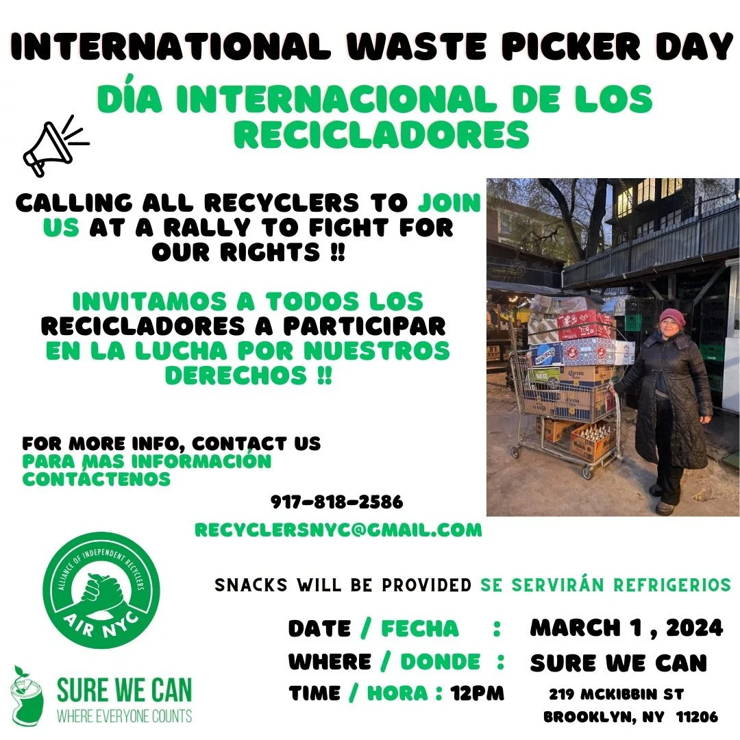 Join us at 12pm on March 1st at Sure We Can for International Waste Pickers’ Day Rally, with the Alliance of Independent Recyclers NYC!